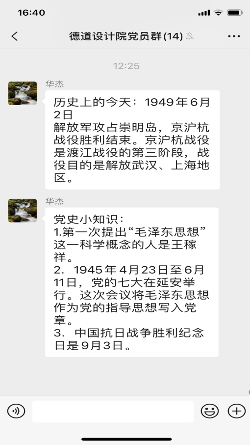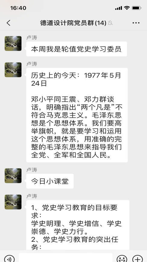 近日,為提升學史學習教育的實效性,設計院支部創(chuàng)新思路,結合工作的特殊性,以“黨員學習群”為載體,開展“輪值學習委員領學”活動,排出學習委員輪值表,支部委員帶頭,黨員跟上,每周由一名“學習委員”,帶領大家開展黨史線上學習。輪值學習委員在值班日當天利用中午時間,通過微信群,“敲黑板、劃重點”,發(fā)布“歷史上的今天”和“今日小課堂”兩個版塊的學習內容。“歷史上的今天”展示了中國共產黨和新中國成立以來重大事件?!敖袢招≌n堂”每日推送三條黨史學習教育內容,讓支部每個黨員在靈活時間內完成學習,汲取知識。