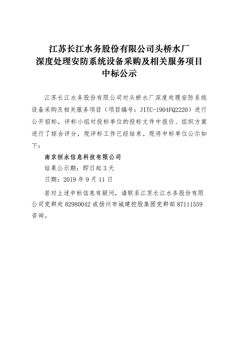 江蘇長江水務(wù)股份有限公司頭橋水廠深度處理安防系統(tǒng)設(shè)備采購及相關(guān)服務(wù)項目中標公示