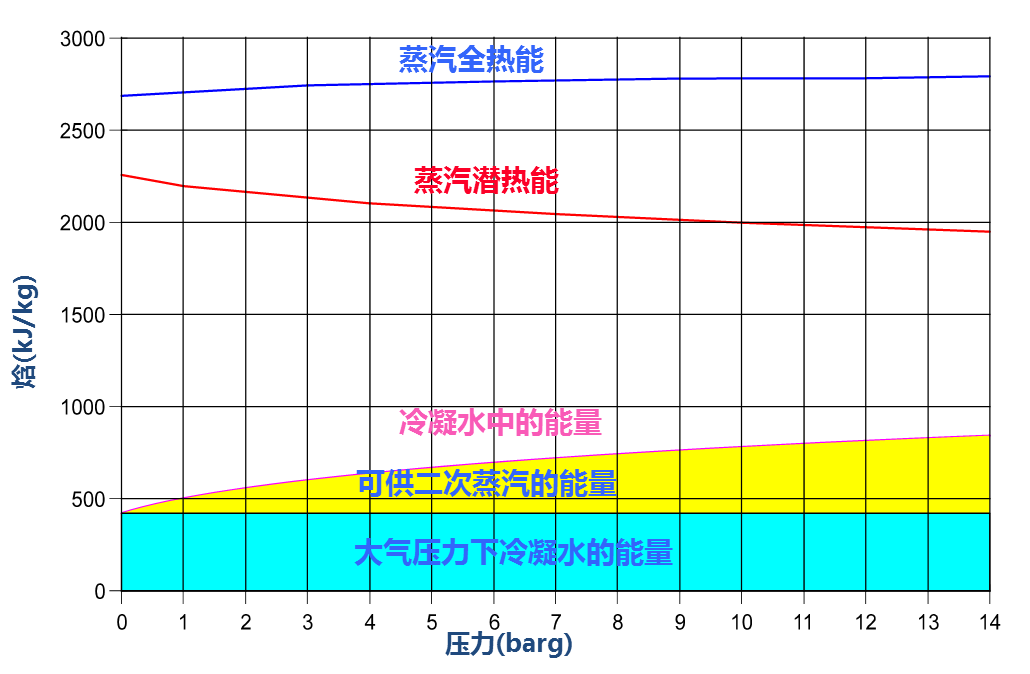 冷凝水所含有的高熱量,回收可實(shí)現(xiàn)節(jié)能、降低蒸汽消耗,如下圖黃色部分即為可回收利用的熱量: