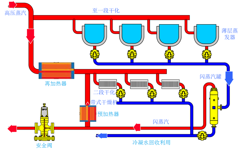 來自薄層蒸發(fā)器的疏水閥排出的高溫、高壓冷凝水全部進(jìn)入閃蒸罐進(jìn)行閃蒸分離,產(chǎn)生的閃蒸蒸汽進(jìn)入預(yù)加熱器,預(yù)加熱器對帶式干燥機(jī)內(nèi)循環(huán)空氣進(jìn)行加熱,當(dāng)溫度不能滿足生產(chǎn)要求時(shí),開啟再加熱器對循環(huán)空氣進(jìn)行再次加熱。閃蒸罐分離后的冷凝水通過底部疏水閥與預(yù)加熱器排出的冷凝水匯合后排入現(xiàn)有蒸汽冷凝水箱。閃蒸罐上設(shè)置安全閥,當(dāng)系統(tǒng)異常,安全閥打開泄壓。