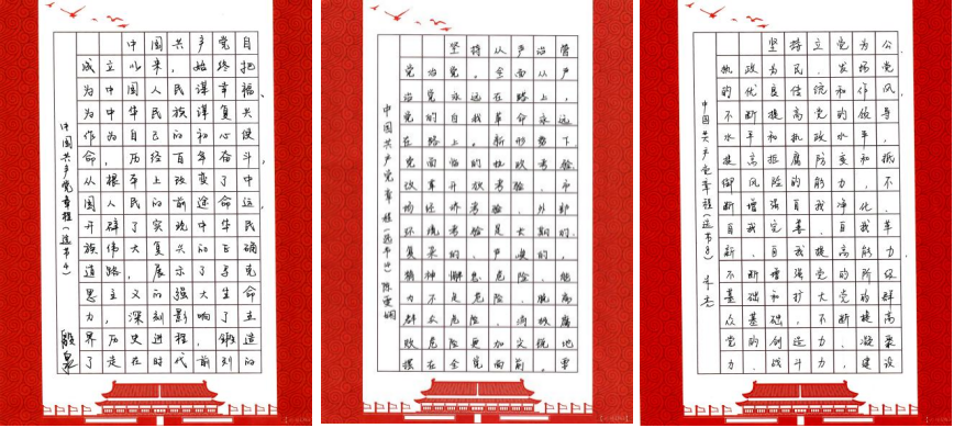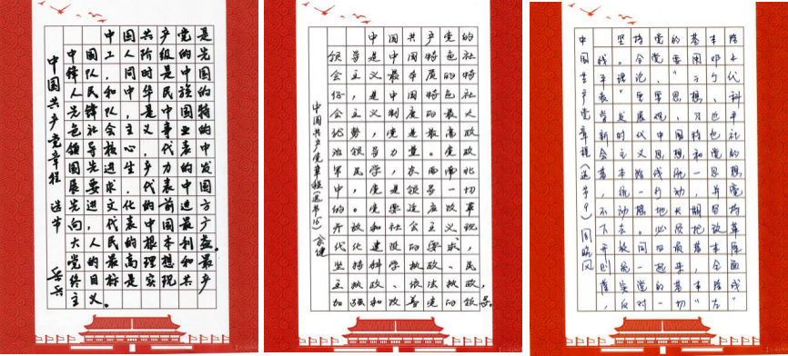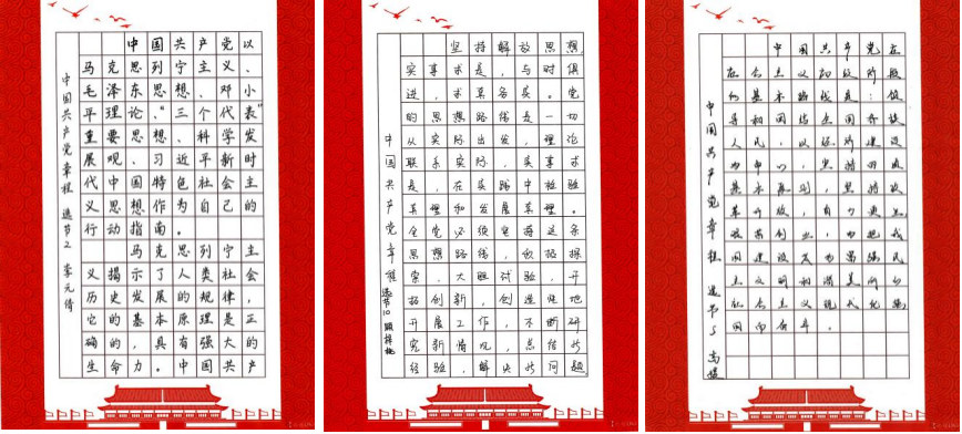 文字入手、意識(shí)入腦、責(zé)任入心。支部黨員利用工作之余,以《中國(guó)共產(chǎn)黨章程(修正案)》為藍(lán)本,堅(jiān)持一筆一畫(huà)工整書(shū)寫(xiě)黨章,一字一句銘記黨章條款,熟悉掌握黨章主要內(nèi)容,深入領(lǐng)會(huì)黨章內(nèi)涵、精神實(shí)質(zhì)以及對(duì)共產(chǎn)黨員的職責(zé)要求。全體黨員抄黨章、學(xué)黨章、悟黨章,內(nèi)外一心,共同在抄寫(xiě)中提升黨性,鑄造黨魂。