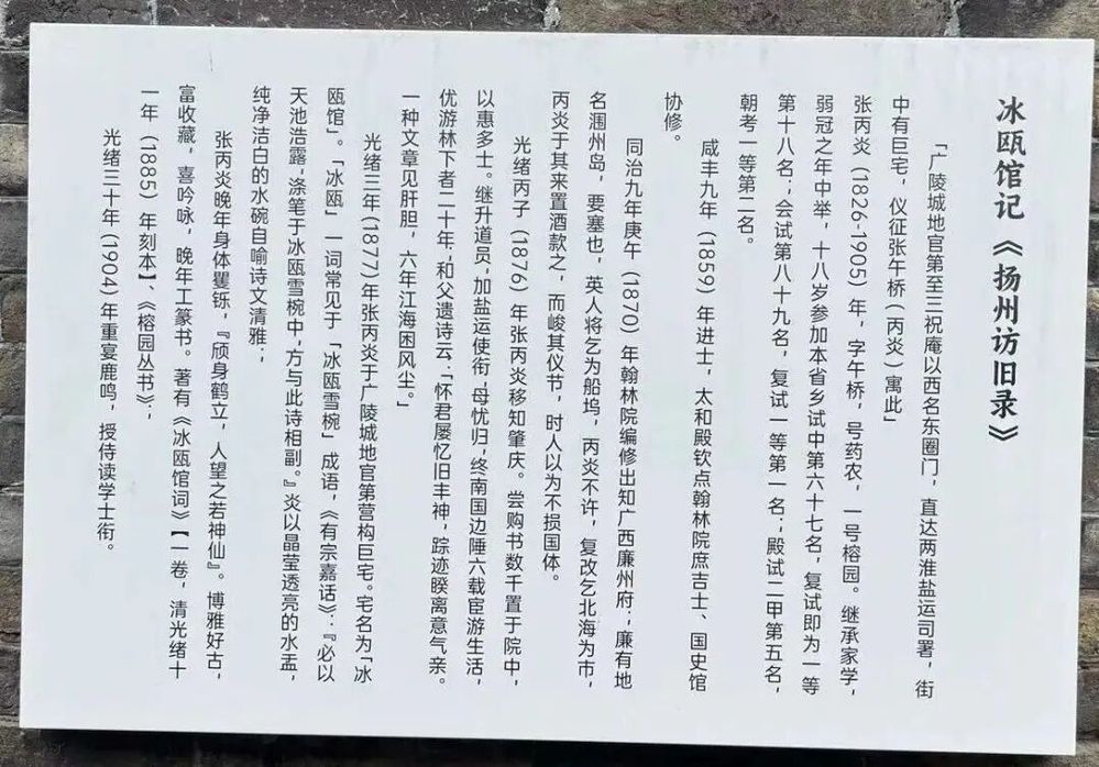 張丙炎的一生,橫跨晚清政治變革與文化轉(zhuǎn)型。他在嶺南的政績(jī)、對(duì)包世臣學(xué)術(shù)的承襲、對(duì)鄉(xiāng)邦文獻(xiàn)的守護(hù),以及冰甌館的營(yíng)建,共同構(gòu)建起一個(gè)士大夫的文化樣本。其故居經(jīng)修繕后獲評(píng)揚(yáng)州市文物保護(hù)單位,更以“民宿+文化空間”模式,成為傳統(tǒng)建筑活化利用的典范。