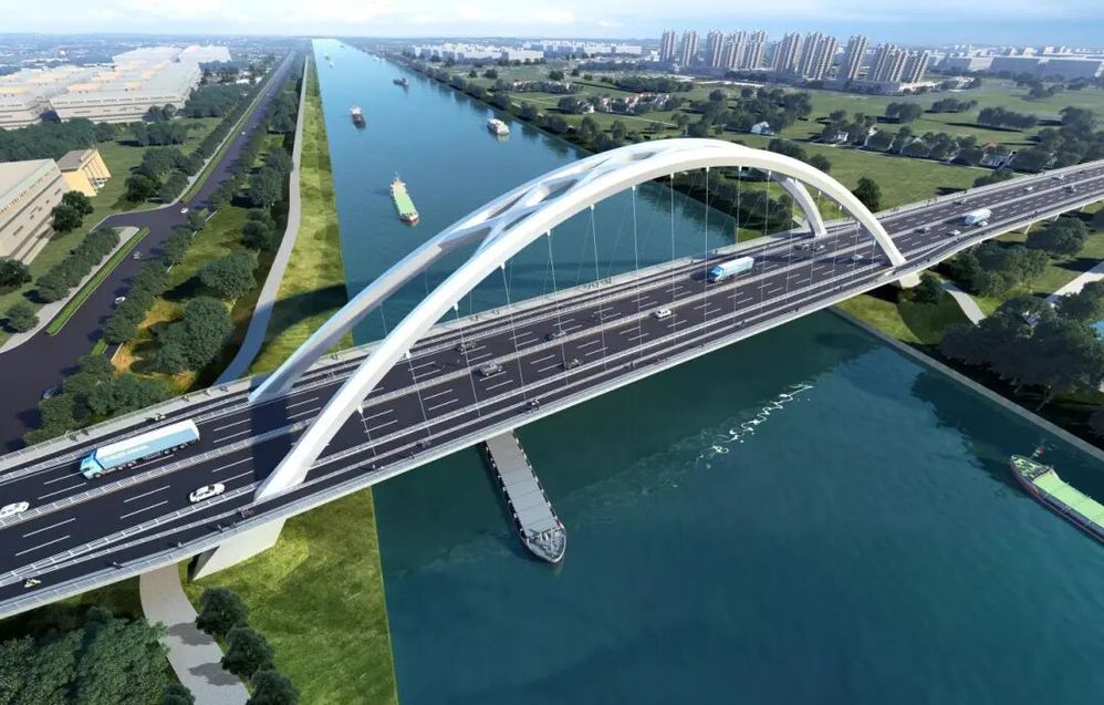 除了核心的道路建設(shè),主要建設(shè)內(nèi)容還包含紅線范圍內(nèi)道路、橋梁、排水、交安、照明、環(huán)保、綠化及相關(guān)附屬設(shè)施等。其中,新建的上跨京杭大運河大橋為項目核心部分,總長度約742m,主跨采用跨徑200m提籃拱橋設(shè)計,既保證通行功能,又具備一定景觀價值。工程計劃總投資約4.09億元,建設(shè)工期約30個月。